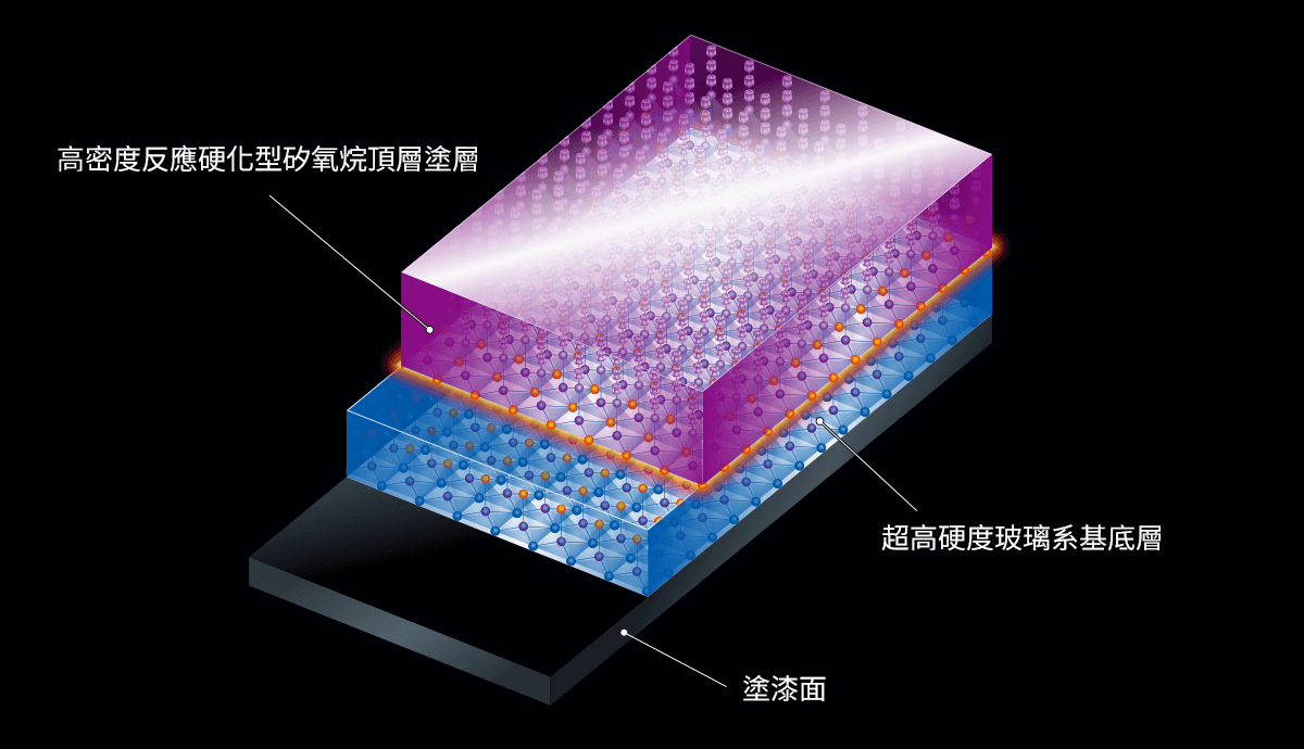 經由強力架橋反應,與具 莫氏硬度 8 級 的「超高硬度玻璃系基底層」形成堅固結合。