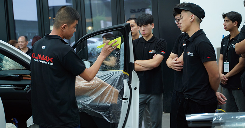 越南團隊雖然年輕,但經驗成熟、態度專業,對學習充滿熱誠。他們的分工非常細緻:有專門的 PPF 施工人員、隔熱紙熟手、鍍膜小組,各司其職,同時也能在關鍵時刻互相支援。更難得的是,施工過程中剪裁的餘料、離型紙等雜物,他們會隨手整理並即時收集,始終維持工作區乾淨有序。許多細節讓人想起在日本總部所見的標準與紀律,確實值得我們效法與學習。